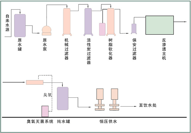 直飲水就是采用特殊工藝將普通水進行加工處理成直接飲用水,然后由專門的管道輸送到飲水處。直飲水的加工工藝分為預處理(精濾、超濾、活性炭、軟化處理)、深度處理(主要是反滲透技術),消毒處理(紫外線和臭氧殺菌)。